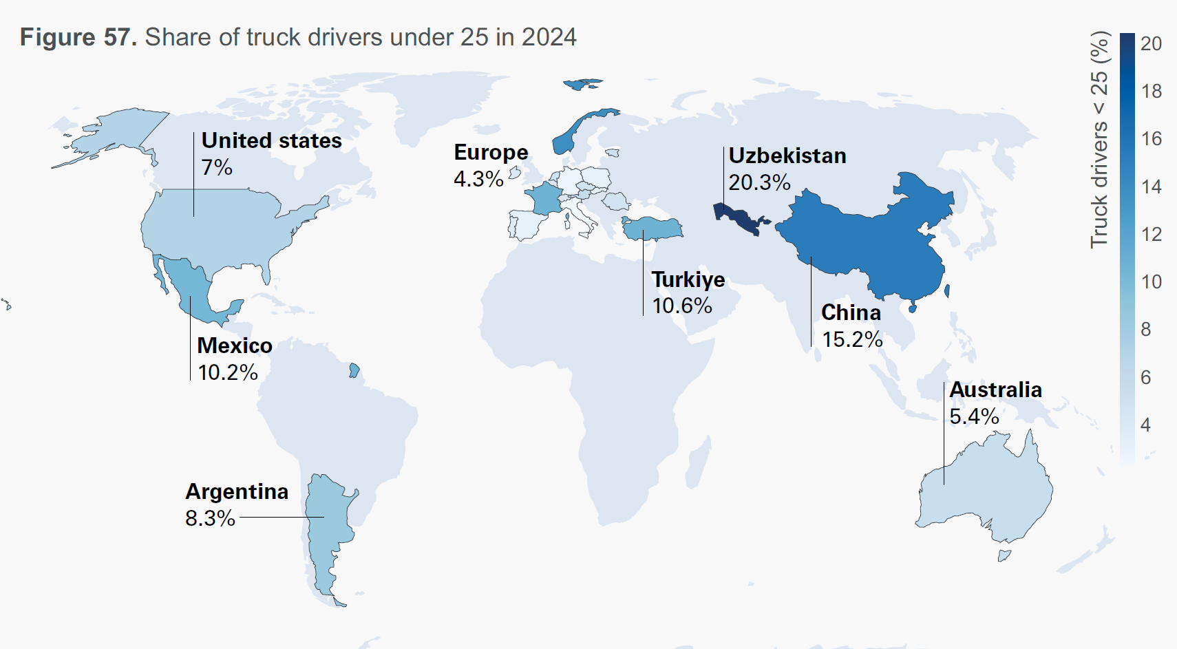 Over the next five years, the report forecasts that 3.4 million truck drivers will retire in the countries studied. In Australia, 21% of current drivers will have retired by 2029. In China it is 18%; in Europe 17%.